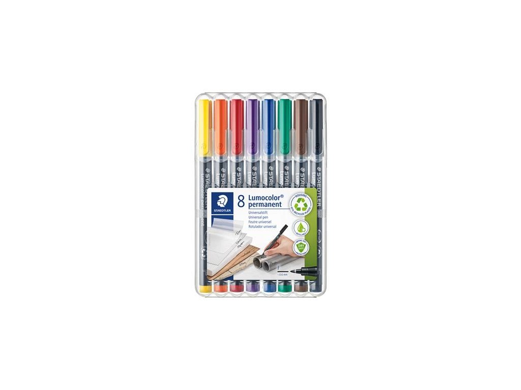 dokonale sa hodí k fóliam do projektorov,na CD, sklo, kov a plast farba vo varbe uzáveru "Dry Safe" - atrament nevyschne bez uzáveru až 2 týždne vodeodolný atrament na báze alkoholu PP telo hrúbka písma: 0,6 mm 8 farieb: žltá, oranžová, červená, fialová, modrá, zelená, hnedá, čierna Značka: STAEDTLER Výrobca: STAEDTLER SE Adresa: Moosäckerstr. 3 , 90427 Nuremberg, Germany Web: http://www.staedtler.com Email: https://www.staedtler.com/intl/en/service/contact/Dodatočné parametre