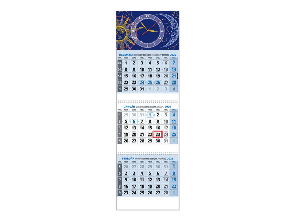 Trojdielny kalendár s menami v SK + CZ, názvy mesiacov a dní v SK, CZ, EN, DE a RU. Hodinky QKDodatočné parametre