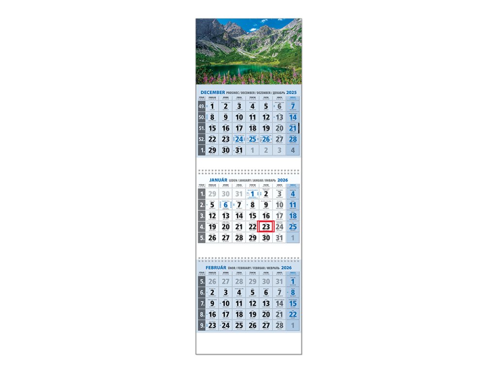 Trojdielny kalendár s menami v SK + CZ, názvy mesiacov a dní v SK, CZ, EN, DE a RU. Obrázok ADodatočné parametre