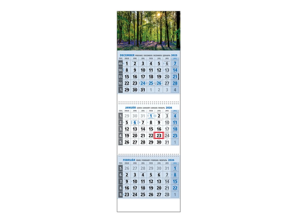 Trojdielny kalendár s menami v SK + CZ, názvy mesiacov a dní v SK, CZ, EN, DE a RU. Obrázok EDodatočné parametre