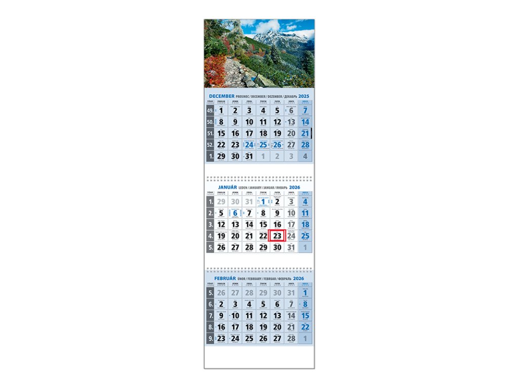 Trojdielny kalendár s menami v SK + CZ, názvy mesiacov a dní v SK, CZ, EN, DE a RU. Obrázok HDodatočné parametre