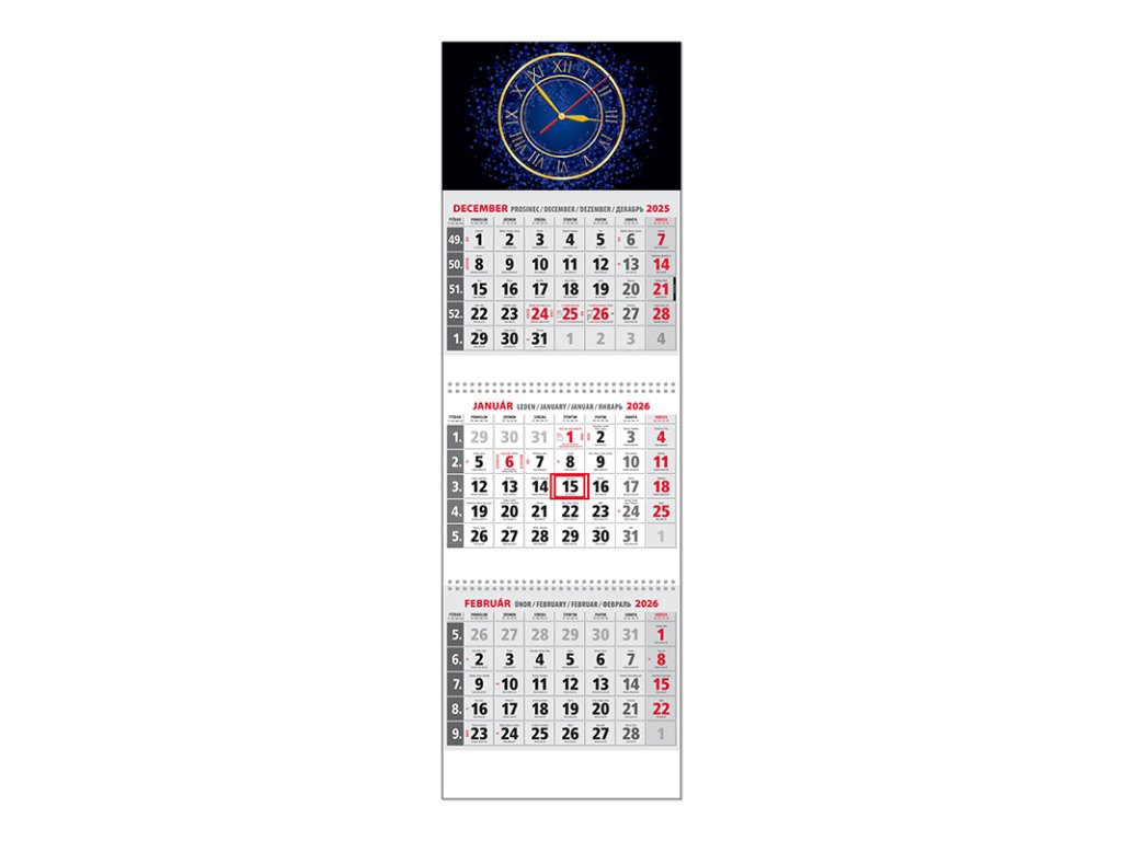 Trojdielny kalendár s menami v SK + CZ, názvy mesiacov a dní v SK, CZ, EN, DE a RU. Hodinky QLDodatočné parametre