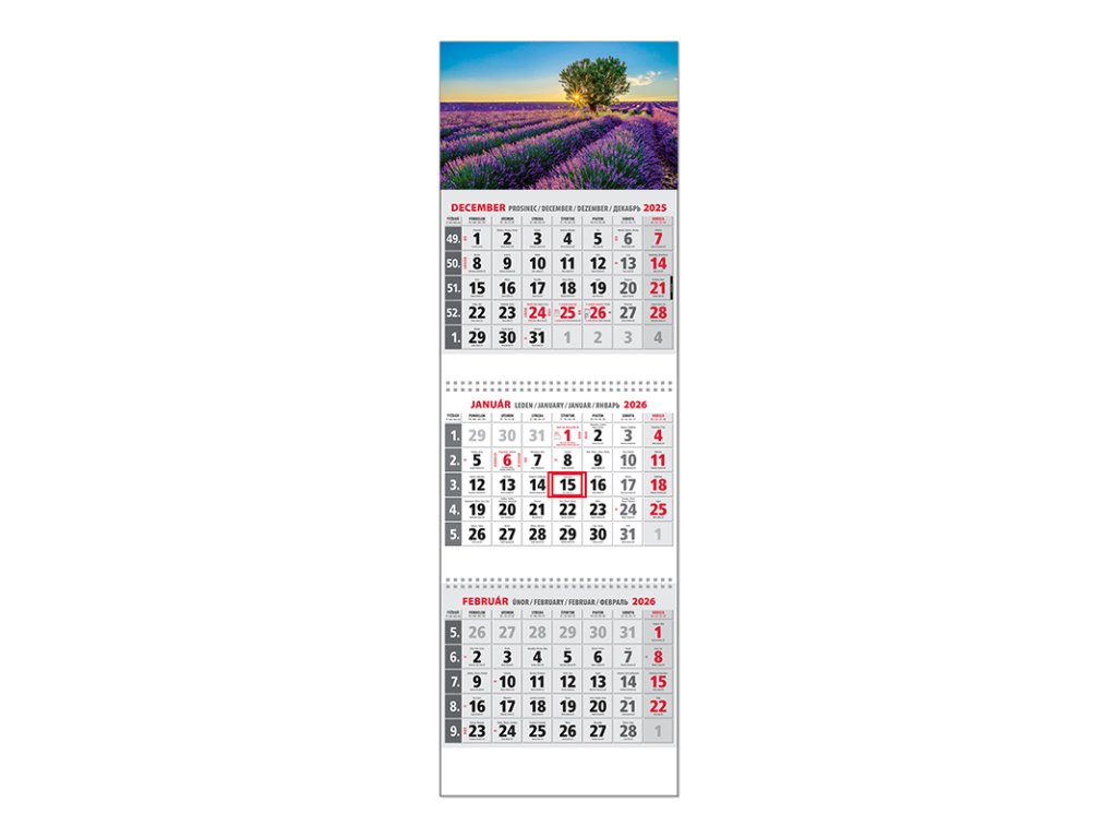 Trojdielny kalendár s menami v SK + CZ, názvy mesiacov a dní v SK, CZ, EN, DE a RU. Obrázok CDodatočné parametre
