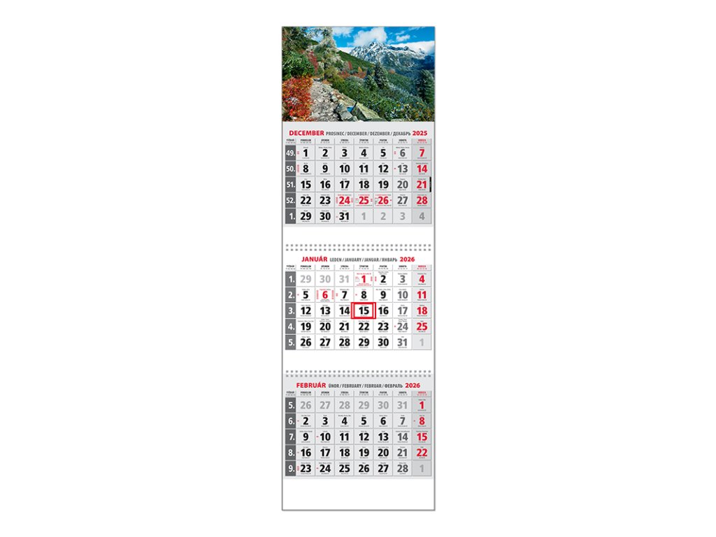 Trojdielny kalendár s menami v SK + CZ, názvy mesiacov a dní v SK, CZ, EN, DE a RU. Obrázok HDodatočné parametre