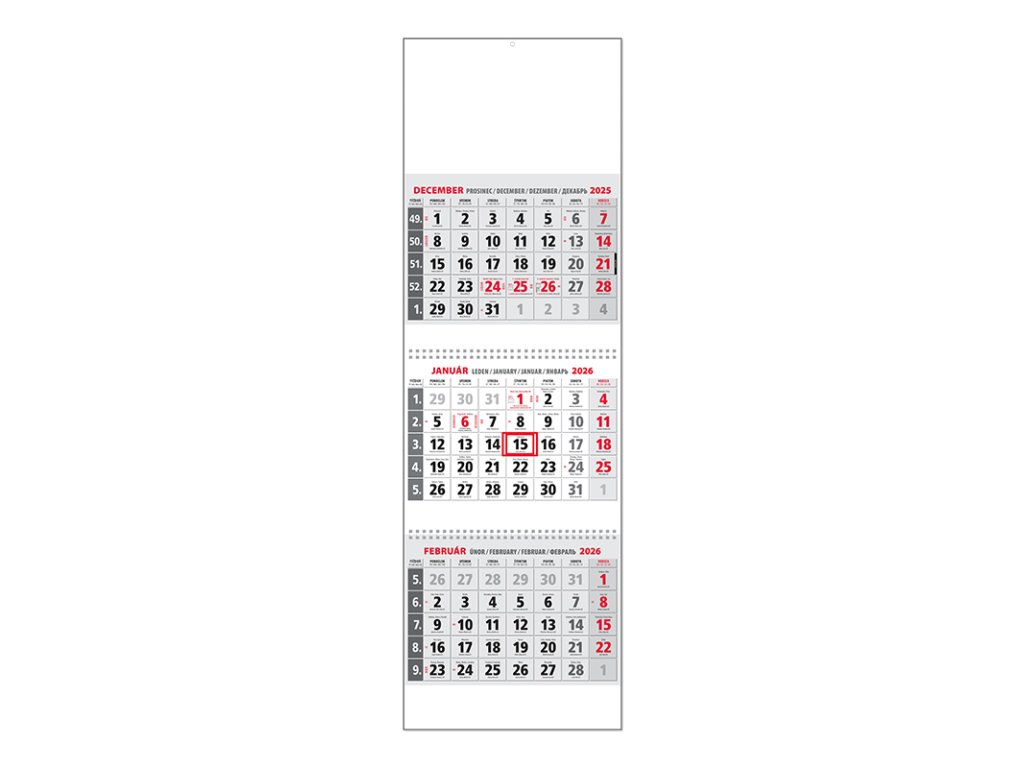 Trojdielny kalendár s menami v SK + CZ, názvy mesiacov a dní v SK, CZ, EN, DE a RU.Dodatočné parametre