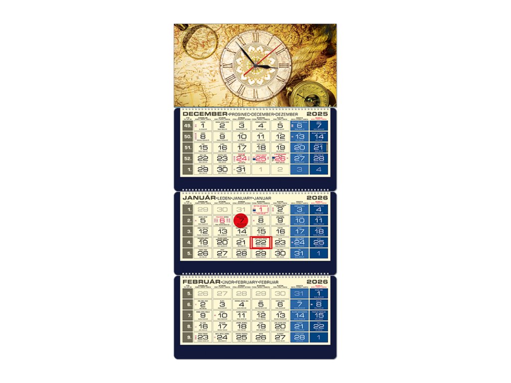 Luxusný trojdielny kalendár s menami v SK + CZ, názvy mesiacov a dní v SK, CZ, UK a DE. Súčasťou kalendárov LUXUS je "elektrostatický označovač" a 13. list s prehľadom všetkých sviatkov EÚ. Hodiny QNDodatočné parametre