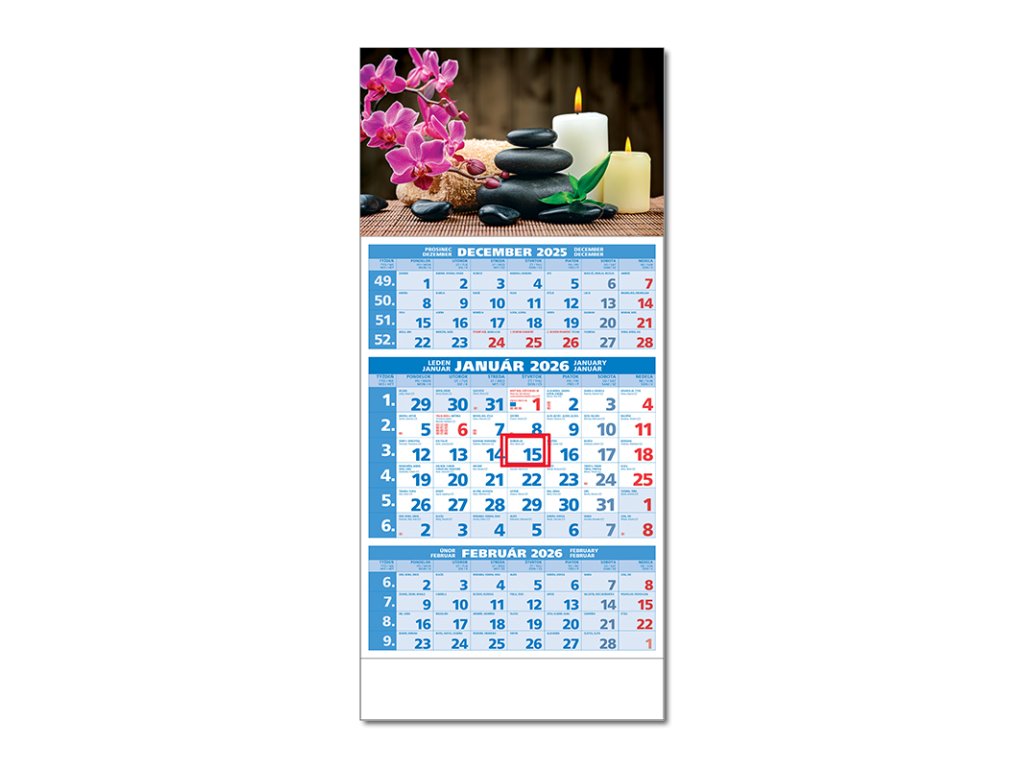 Plánovací 3-mesačný modrý kalendár s priloženou hornou čistou lištou, s menami v SK + CZ, názvy mesiacov a dní v SK, CZ, UK, DE a HU. . Možnosť výberu obrázku. Obrázok GDodatočné parametre