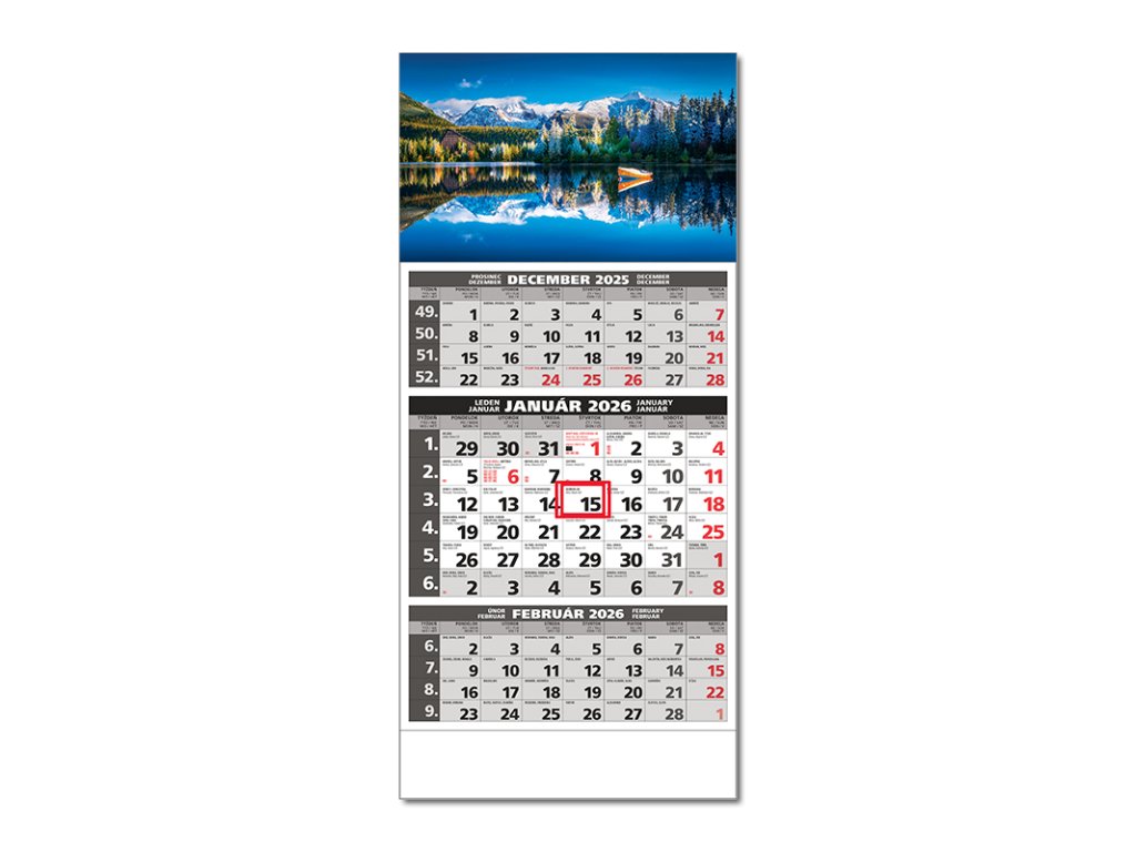 Plánovací 3-mesačný sivý kalendár s priloženou hornou čistou lištou, s menami v SK + CZ, názvy mesiacov a dní v SK, CZ, UK, DE a HU. Možnosť výberu obrázku. Obrázok BDodatočné parametre