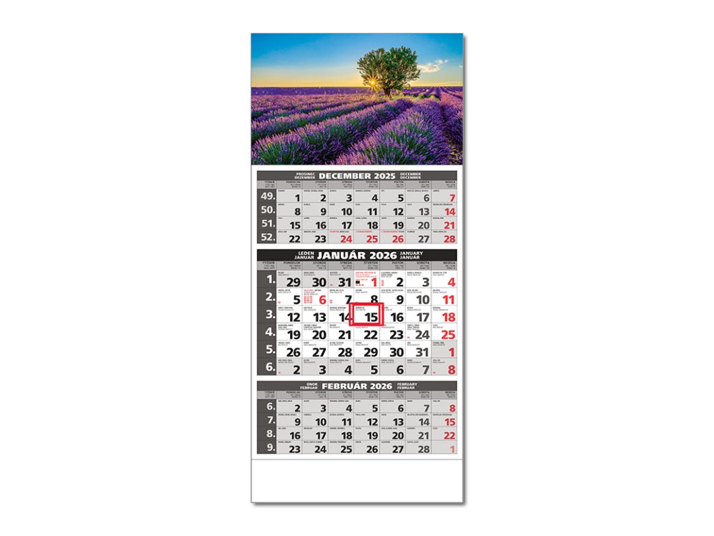 Plánovací 3-mesačný sivý kalendár s priloženou hornou čistou lištou, s menami v SK + CZ, názvy mesiacov a dní v SK, CZ, UK, DE a HU. Možnosť výberu obrázku. Obrázok CDodatočné parametre