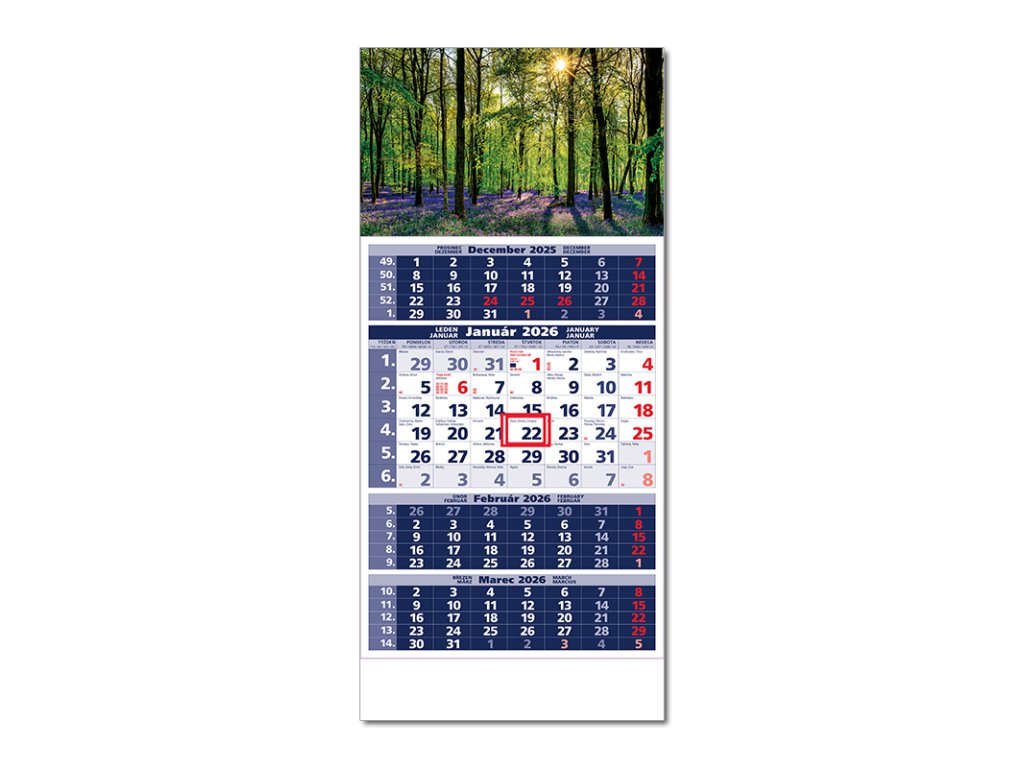 Plánovací kalendár so 4-mesačným kalendáriom s menami v SK, názvy mesiacov a dní v SK, CZ, EN, DE a HU. Obrázok EDodatočné parametre
