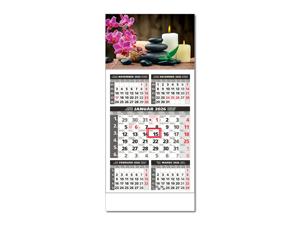 Plánovací kalendár s 5-mesačným kalendáriom s menami v SK, názvy mesiacov a dní v SK, CZ, UK, DE a FR. Možnosť výberu obrázku. Obrázok GDodatočné parametre