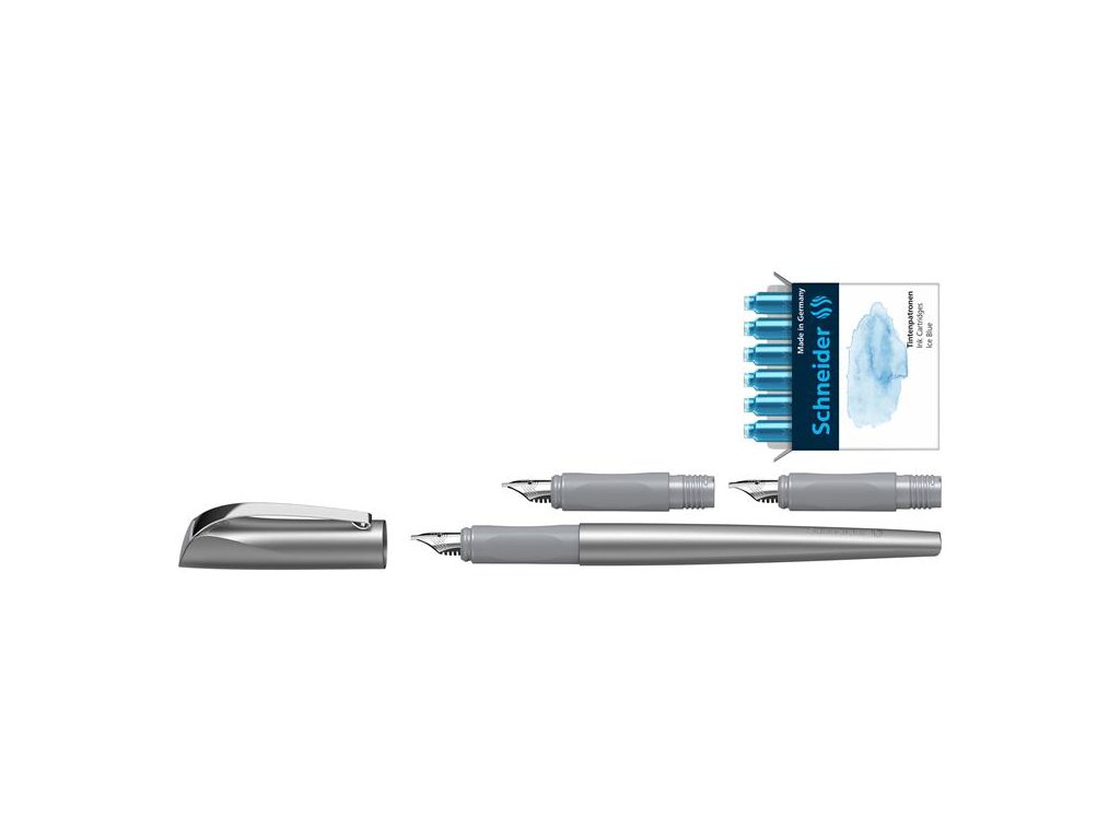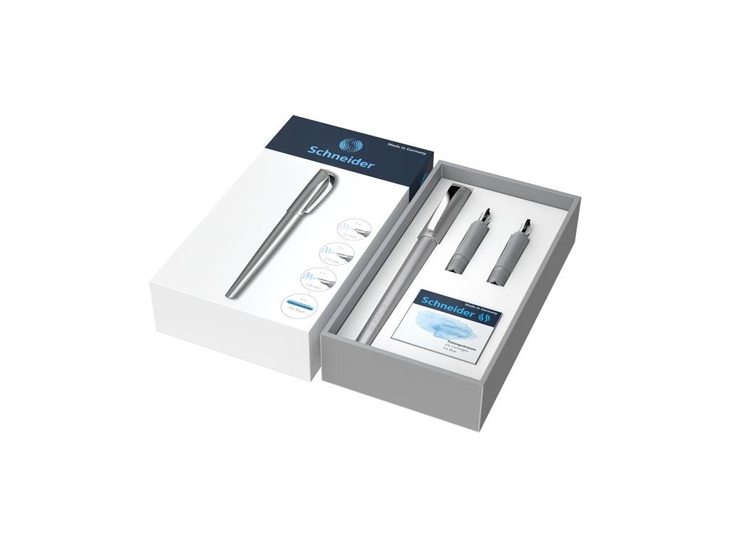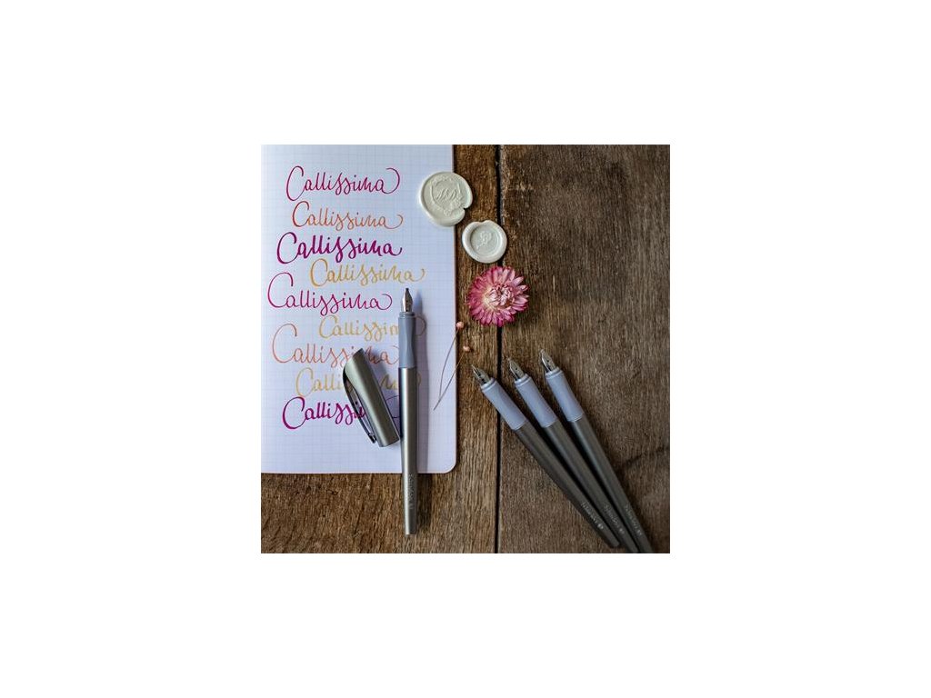 vďaka plochému a rovnému hrotu je plniace pero SCHNEIDER Callissima dokonalou voľbou pre kalligrafické písmo sada obsahuje: 1x plniace pero s 1,1 mm hrotom 1x 1,5 mm hrot 1x 1,8 mm hrot elegantný kovovo lesklý vzhľad kovový klip modrý atrament tenké telo pera a ergonomické vyhotovenie zabezpečujú pohodlné držanie pera a presné písanie vhodné pre pravákov aj ľavákov vďaka vymeniteľnému hrotu je možné meniť aj hrúbku písma kompatibilné s klasickými bombičkami dokonalý darčekDodatočné parametre