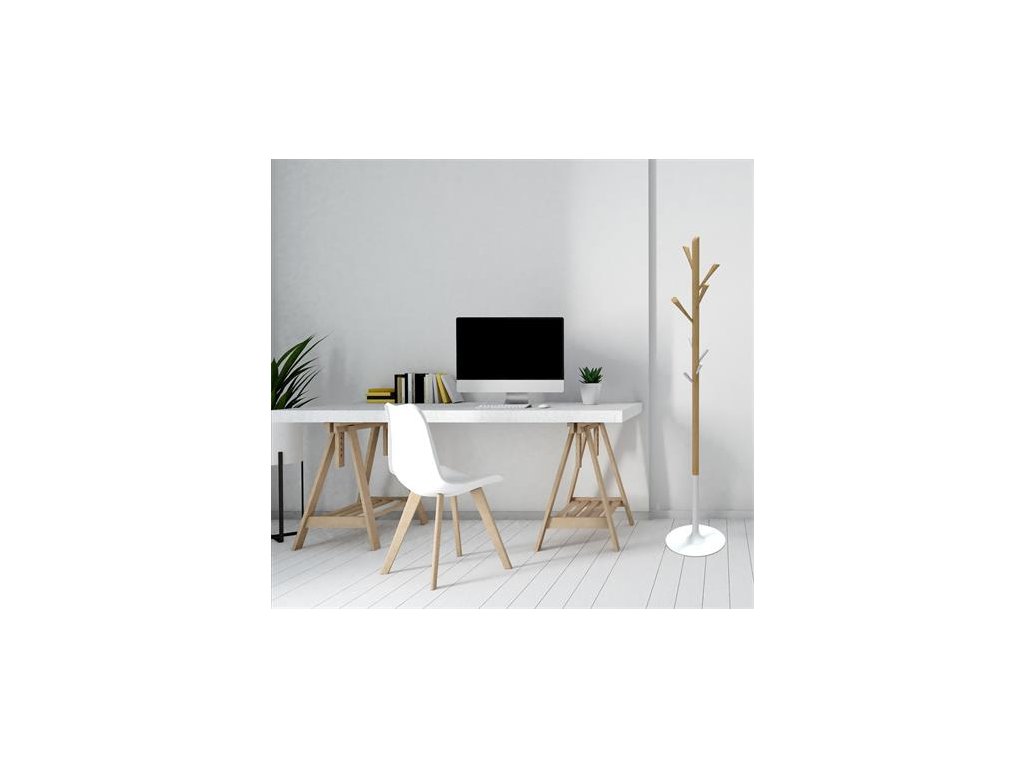 Podlahový vešiak, drevená konštrukcia, 8 ks vešiakov, ALBA, drevo/biela