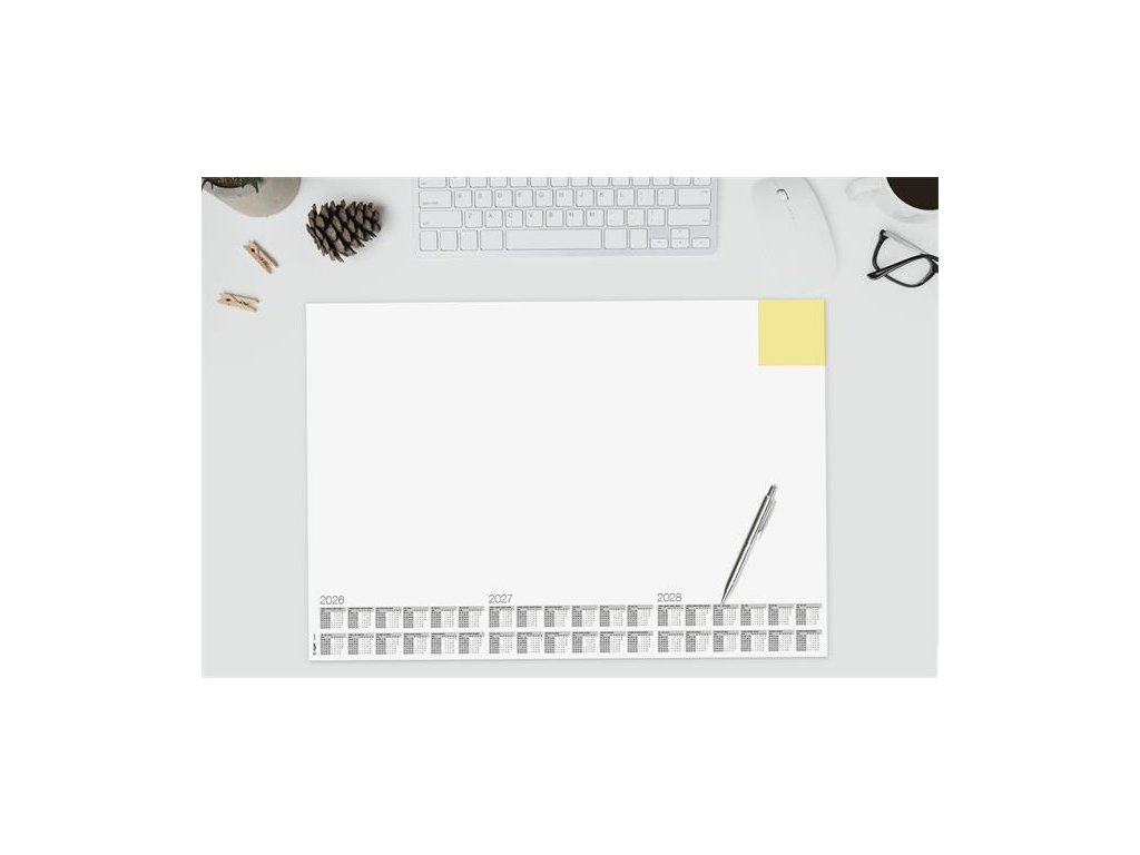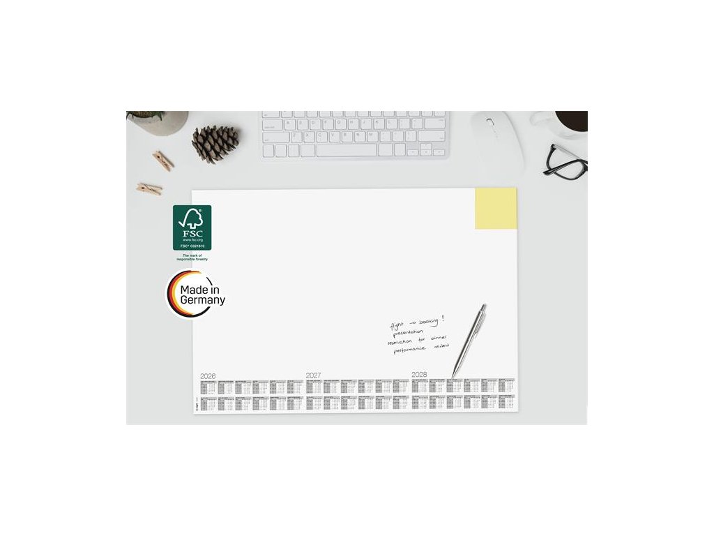 s trojročným kalendárom (2026/2027/2028) -štvorjazyčný: angličtina, nemčina, francúzština a holandčina -veľkosť: približne A2 -odolný, protišmykový a vďaka masívnej kartónovej zadnej doske úplne rovno leží -použiteľný aj ako podložka pod myš -30 listov -farba: biela -s certifikátom FSC