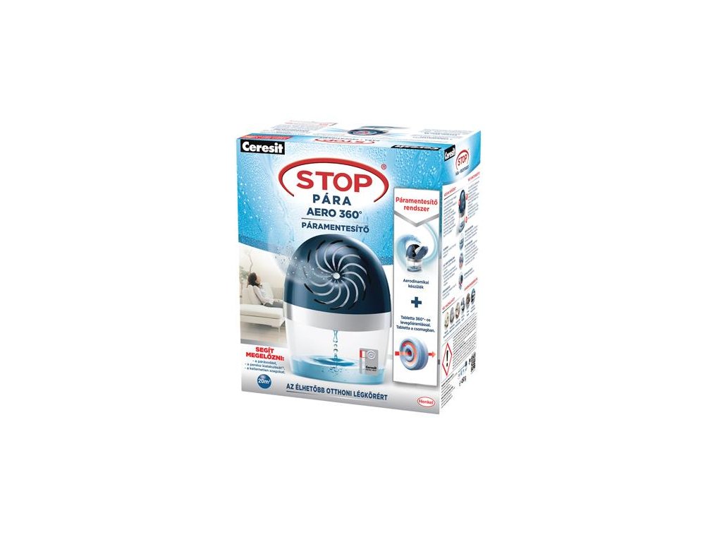 Ceresit STOP VLHKOSTI AERO 360°, nový systém pohlcovania vlhkosti od spoločnosti Henkel optimalizuje nadmernú vlhkosť vzduchu prostredníctvom 360° cirkulácie vzduchu. Zaisťuje tak vysoký účinok pohlcovania vlhkosti a neutralizuje zápach, nastavuje nové štandardy. Systém AERO 360° funguje na fyzikálnom princípe - čím väčší je kontakt tablety so vzduchom, tým väčší je jej absorpčný účinok. Aerodynamický tvar prístroja má unikátny 360° vzdušný otvor na prúdenie vzduchu, ktorý umožňuje cirkuláciu vzduchu okolo a cez tabletu. Prístroj okamžite po vložení tablety začne vstrebávať nadbytočnú vlhkosť zo vzduchu. Tableta AERO 360° používaním postupne zmenšuje svoj objem a keď úplne zmizne, je nutné vložiť novú. Tekutinu po úplnom rozpustení tablety vylejte zo zásobníka. Ceresit AERO 360° nepotrebuje na svoju činnosti energiu ani vašu kontrolu - pracuje úplne samostatne a bezpečne. Predstavuje riešenie problému s vlhkosťou, ktoré je ohľaduplné k životnému prostrediu!Dodatočné parametre