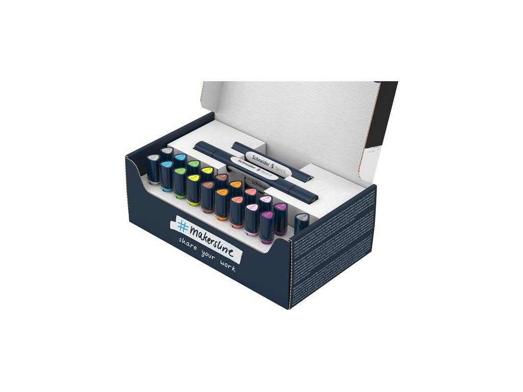 Produktový rad "Makers Line": Žite svoju kreatívnu stránku! Nová, inovatívna sada obojstranných popisovačov s plniacimi náplnmi s jemným kužeľovým hrotom a mäkkým hrotom v tvare štetca pre kreatívnu prácu. - praktický box pre jednoduché skladovanie - sada 27 kusov - svetlé farby, umelecké prechody farieb -10 farieb s dvoma hrotmi -atrament na vodnej báze bez zápachu pre vynikajúce výsledky - jemné farebné prechody možno dosiahnuť pomocou štetca na miešanie a miešanie farieb - telo pera je vhodné pre použitie dvoch náplní, ktoré je možné ľubovoľne kombinovať, čím sa ušetrí použitie plastu -medzinárodne uznávaný vynikajúci dizajn -92 %* je šetrný k životnému prostrediu a šetrí zdroje, je vyrobený z recyklovaného plastu -v porovnaní s tradičným plastom úspora >80 % emisií CO2 vďaka použitiu recyklovaného plastuDodatočné parametre