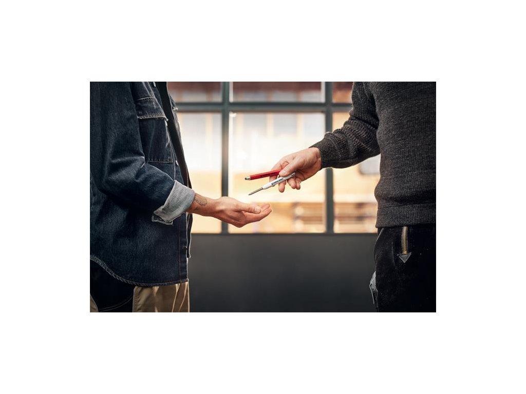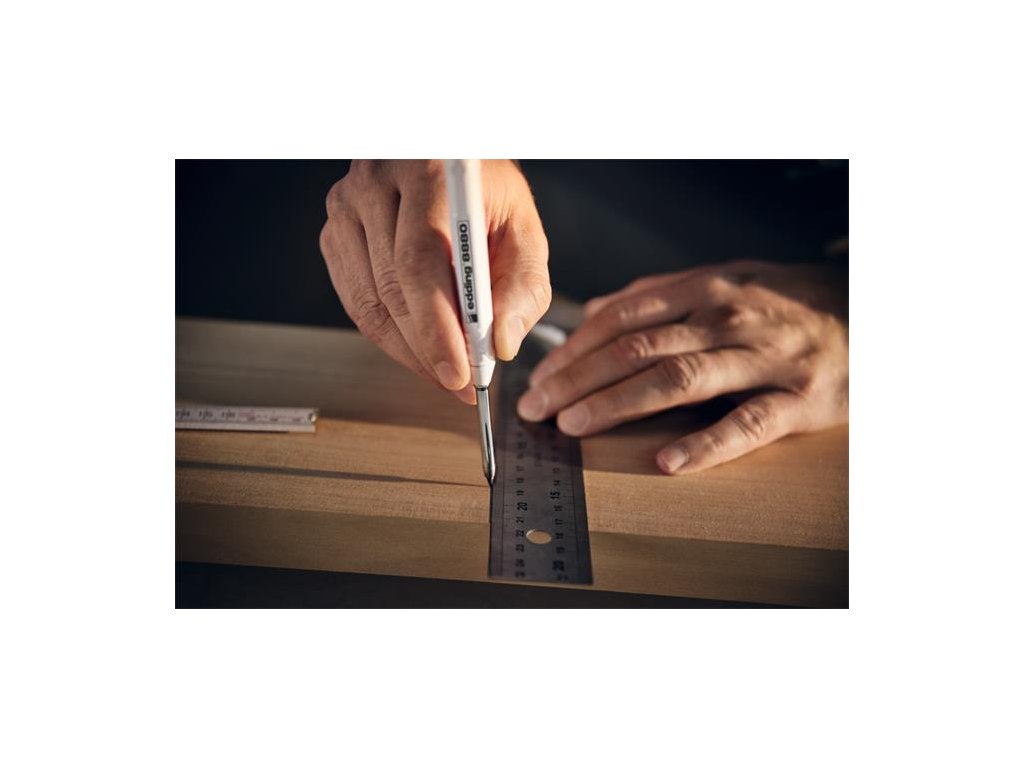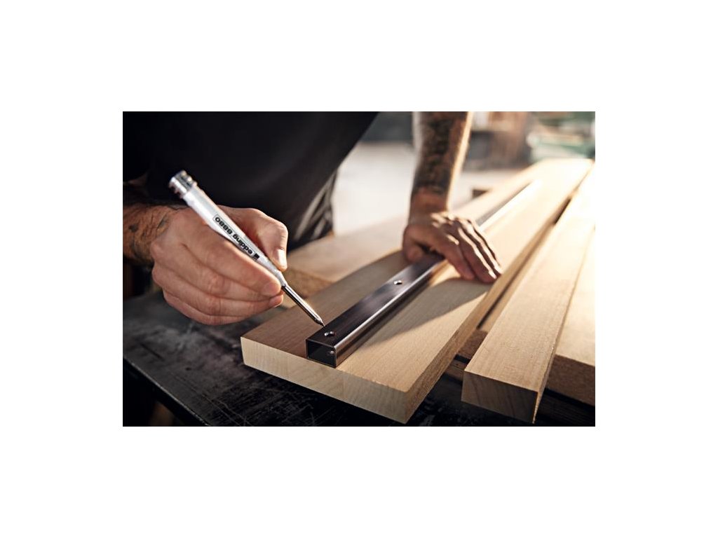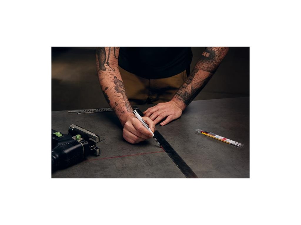 Popisovač na značenie otvorov v praktickom puzdre, pre presné značenie na takmer akýkoľvek materiál, ako napr drevo, kov, plast, dlaždice a lepenka.- robustné hliníkové telo