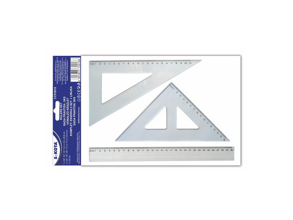 3 ks sada sada obsahuje: 1 x 45°, 21 cm trojuholníkové pravítko 1 x 60°, 16 cm trojuholníkové pravítko 1 x 30 cm pravítkoDodatočné parametre