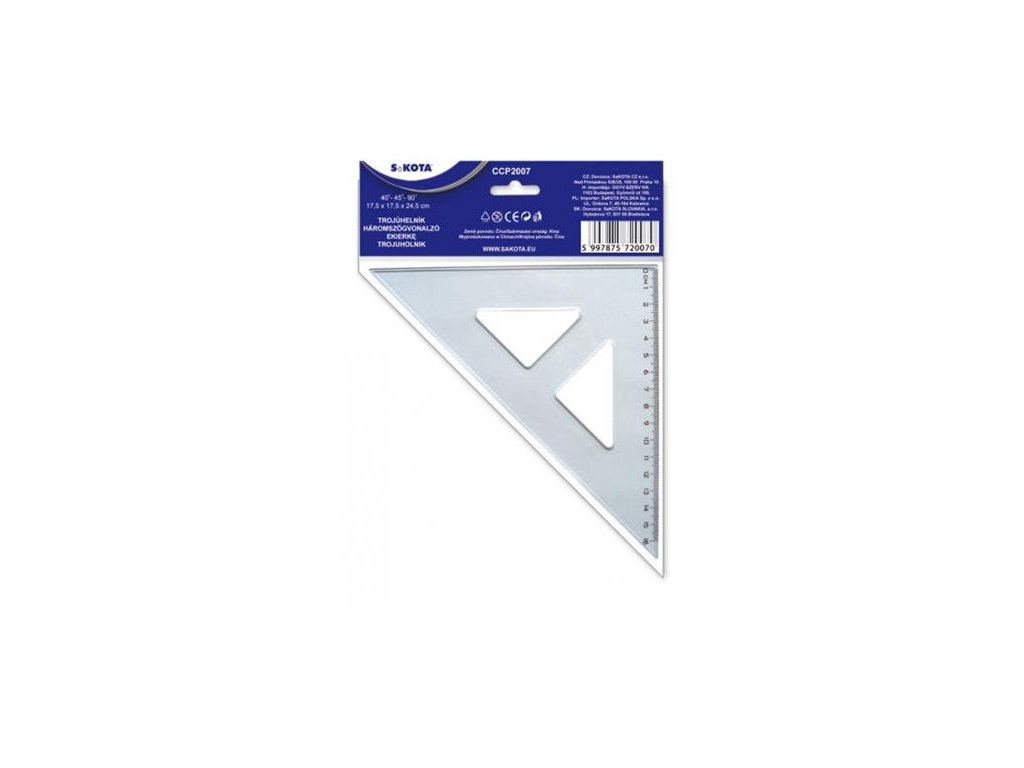 45° trojuholníkové pravítko s kolmicou, rozmery: 17,5x17,5x24,5 cm jednotlivo balené vrecko s uškomDodatočné parametre