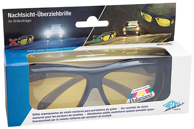 Okuliare WEDO Wraparound môžu používať aj ľudia, ktorí nosia okuliare, a sú určené na šoférovanie v náročných poveternostných podmienkach, v noci a v hmle, v daždi a slabom osvetlení. Polarizačné šošovky znižujú oslnenie blikajúcimi svetlometmi a oslnenie na mokrej vozovke. Zlepšujú tiež kontrastné videnie v zamračenom a hmlistom počasí. - farba rámu: čierna - farba šošoviek: žltá - s puzdrom na okuliare a návodom na použitie - kategória filtra: 1 (mierne tónované sklá, s obmedzenou ochranou proti priamemu slnečnému žiareniu) - vyrobené v súlade s normou EN ISO 12312-1:2022 - blistrové balenie
