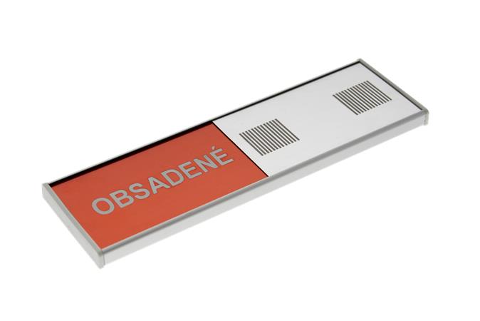 "Voľné/Obsadené" hliníková nástenná tabuľa, vhodná na umiestnenie vedľa kancelárskych dverí alebo pred rokovacie miestnosti.