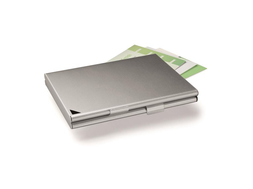 Elegantné hliníkové puzdro na vizitky s matným strieborným povrchom.
