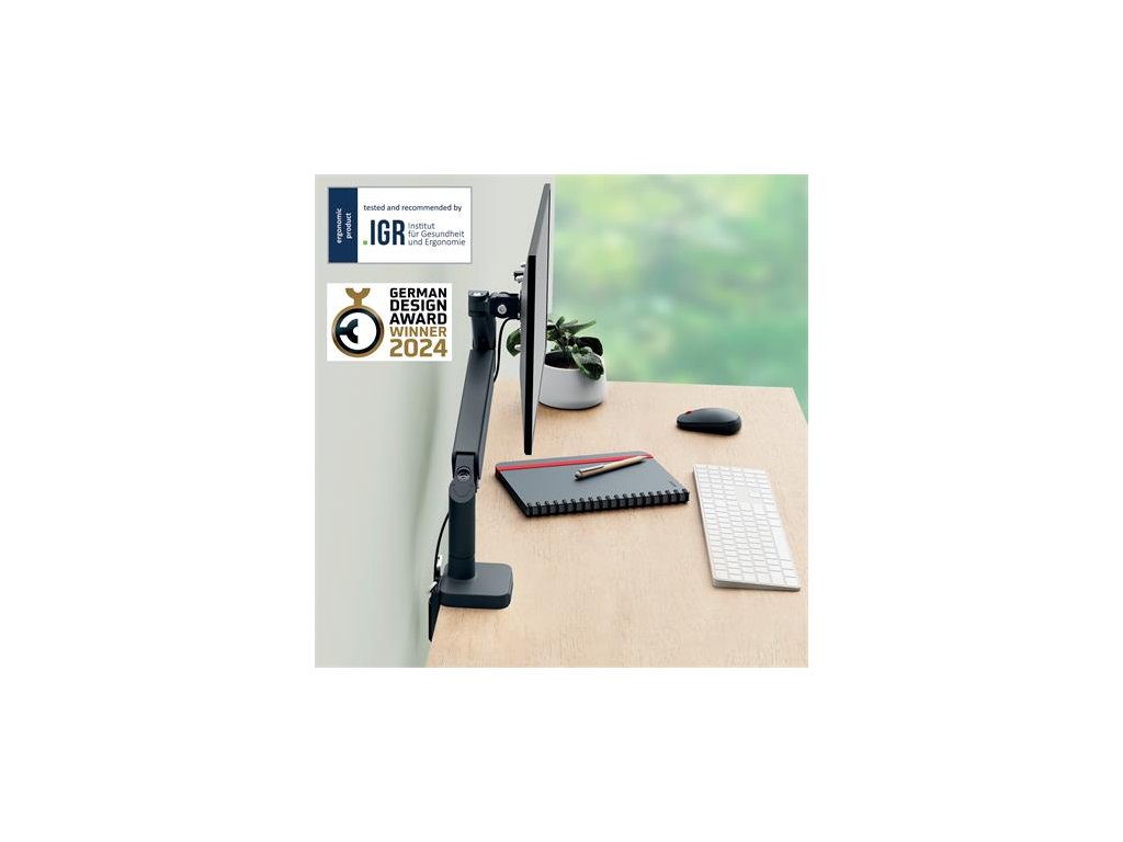 - Ergonomické rameno pre jeden monitor, ktoré pri správnom nastavení napomáha správnemu držaniu tela, nastaveniu do výšky očí a zvyšuje pohodlie krku a ramien
