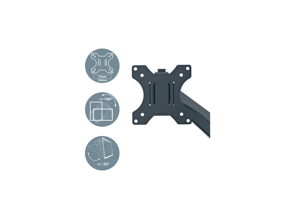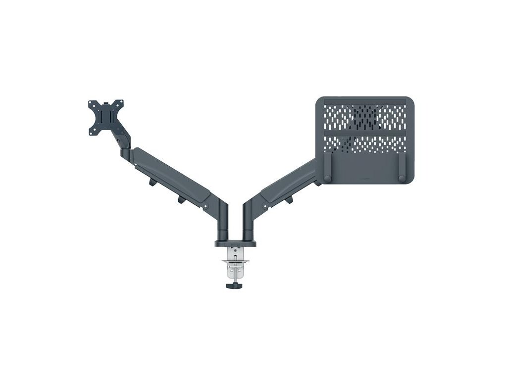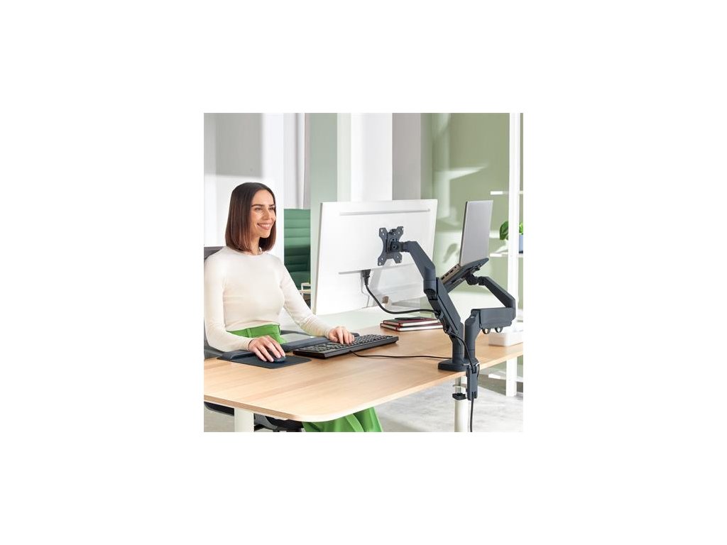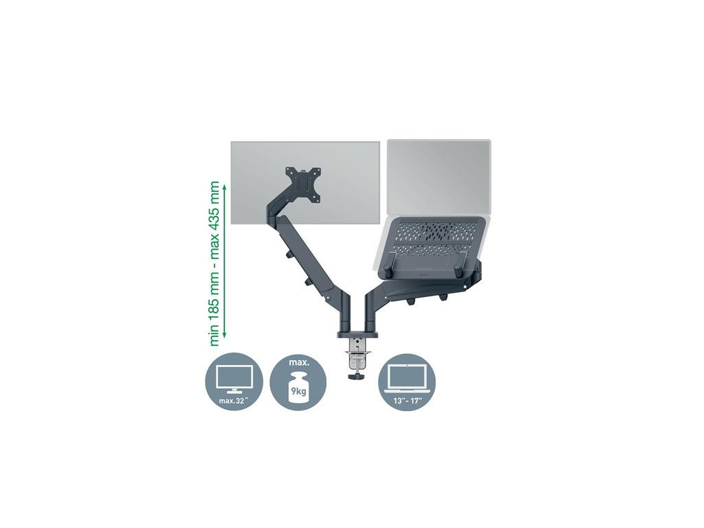- Dvojité ramená s pružinovou oporou na jednoduché nastavenie výšky monitora (185–435 mm) alebo notebooku