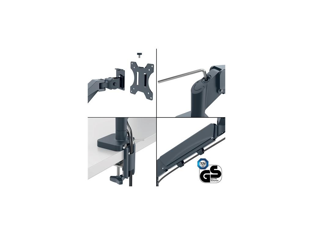 - Jednoduchá inštalácia pomocou priloženej rýchloupínacej odnímateľnej dosky Vesa® (75 a 100 mm) a silikónovej pogumovanej c-skrutky, ktorá znižuje vibrácie a chráni povrch stola, alebo pomocou priechodky v stole (rozsah hrúbky stola: 10–80 mm). Náradie na montáž a nastavenie je súčasťou balenia