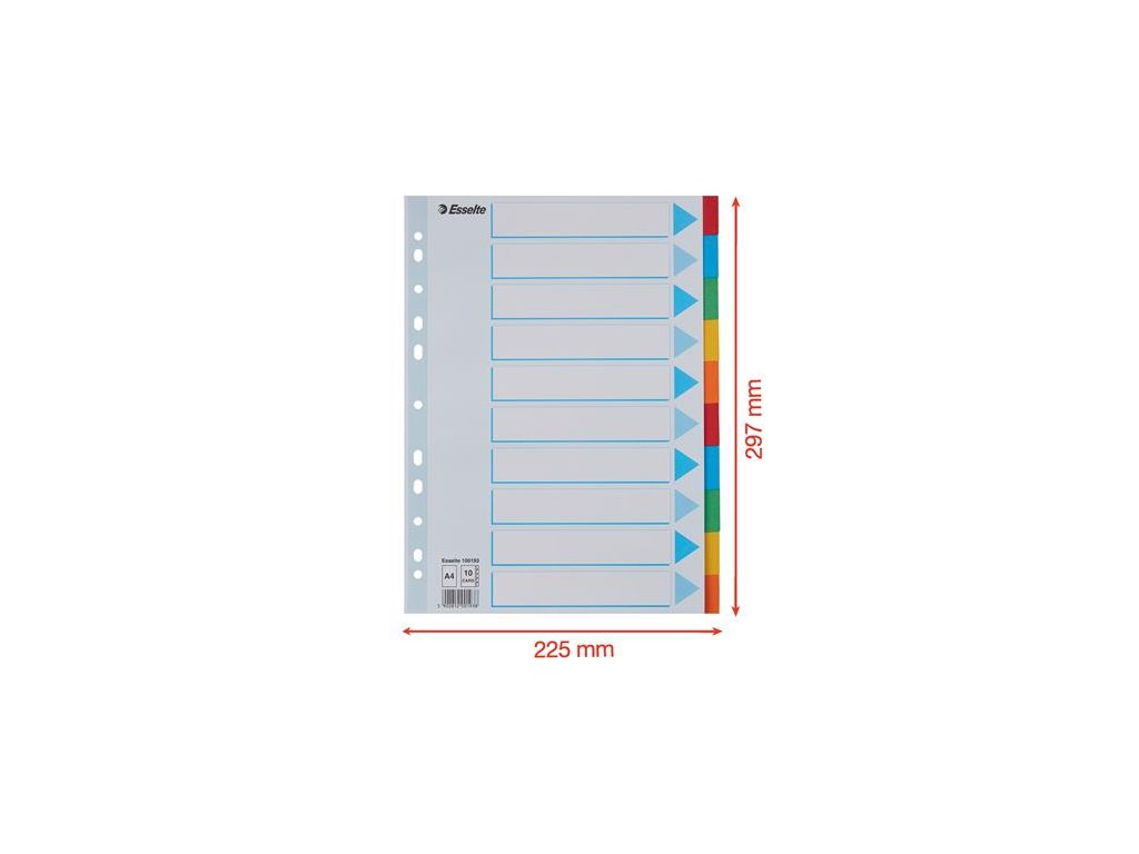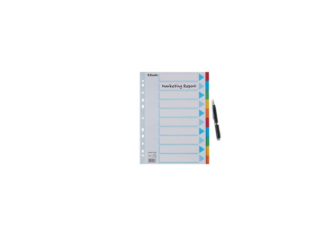 formát: A4 praktické riešenie pre triedenie dokumentov popisovateľná predná strana odolný recyklovaný kartón, 160 g/m2 farebné listy počet dier: 11 Značka: ESSELTE Výrobca: Esselte Kft. Adresa: 1139 Budapest, Lomb u. 37-39. A ép. II. 8., Hungary Web: https://www.accobrands.com/brands/ Email: hungarymarketing@acco.comDodatočné parametre