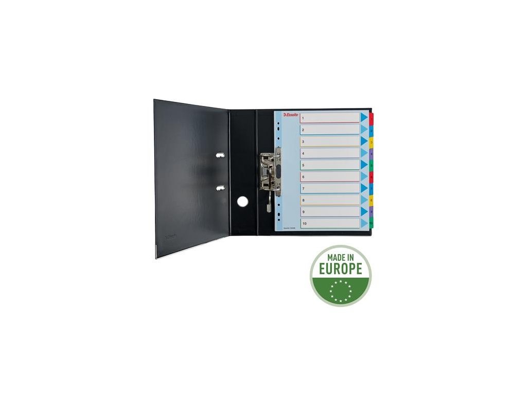 laminovaná kartónová predná strana guličkovým perom popisovateľné, gumou odstrániteľné písmo ušká sú pokryté farebným plastom formát A4 maxi sprehľadňuje orientáciu v dokumentoch založených v závesných obaloch počet dier: 11 materiál: laminovaný kart=on (160 g/m2) Značka: ESSELTE Výrobca: Esselte Kft. Adresa: 1139 Budapest, Lomb u. 37-39. A ép. II. 8., Hungary Web: https://www.accobrands.com/brands/ Email: hungarymarketing@acco.comDodatočné parametre