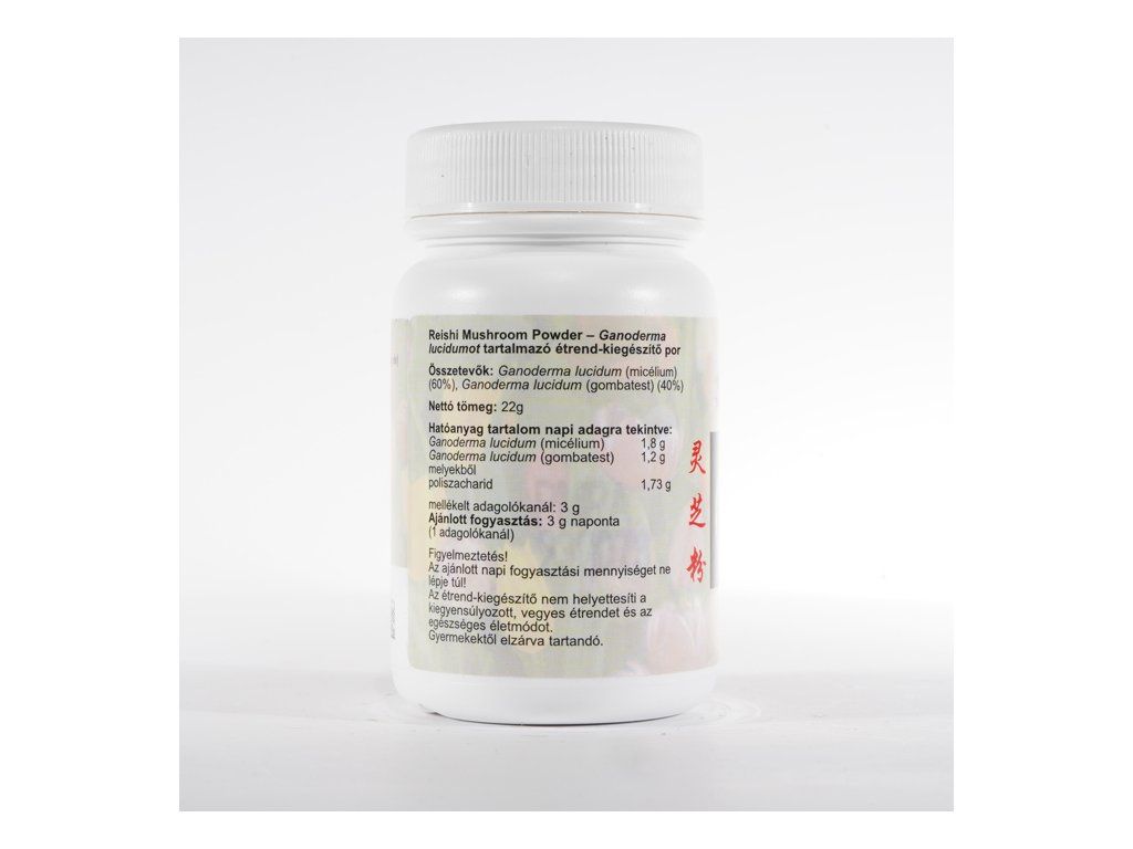 Tento účinný produkt je jednou z najkvalitnejších variantov Ganodermy vyrábaných spoločnosťou DXN po rokoch starostlivého výskumu a dôkladného výskumu. DXN Reishi Mushroom Powder je skutočná zmes čistého extraktu plodového tela Ganoderma (Reishi Gano RG) v kombinácii s mycélia (Ganocelium GL root). Zvláštnosťou je exkluzívna povrchová úprava DXN Ganoderma v konzistencii ako prášok s prínosom extraktu. Prášok možno ľahko pridať do teplého nápoja alebo do teplého jedla. Dávkovanie: 1 odmerka prášku denne (priložená odmerka = cca 3 g), rozpustiť v 2 dl vody Zloženie: 60% Ganoderma lucidum (mycélium), 40% Ganoderma lucidum (plodnice) Doplnok stravy neslúži ako náhrada pestrej stravy a nenahrádza lieky predpísané lekárom. Neprekračujte odporúčané denné dávkovanie. Skladujte na chladnom a suchom mieste. Uchovávajte mimo dosahu detí.