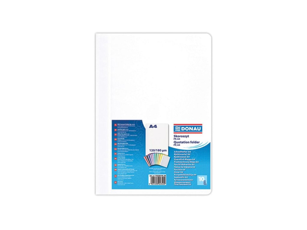 Štandardný polypropylénový rýchloviazač s priehľadnou prednou stranou a nasúvacím popisným pásikom. Formát A4. Balenie 10 ks.Farba: biela