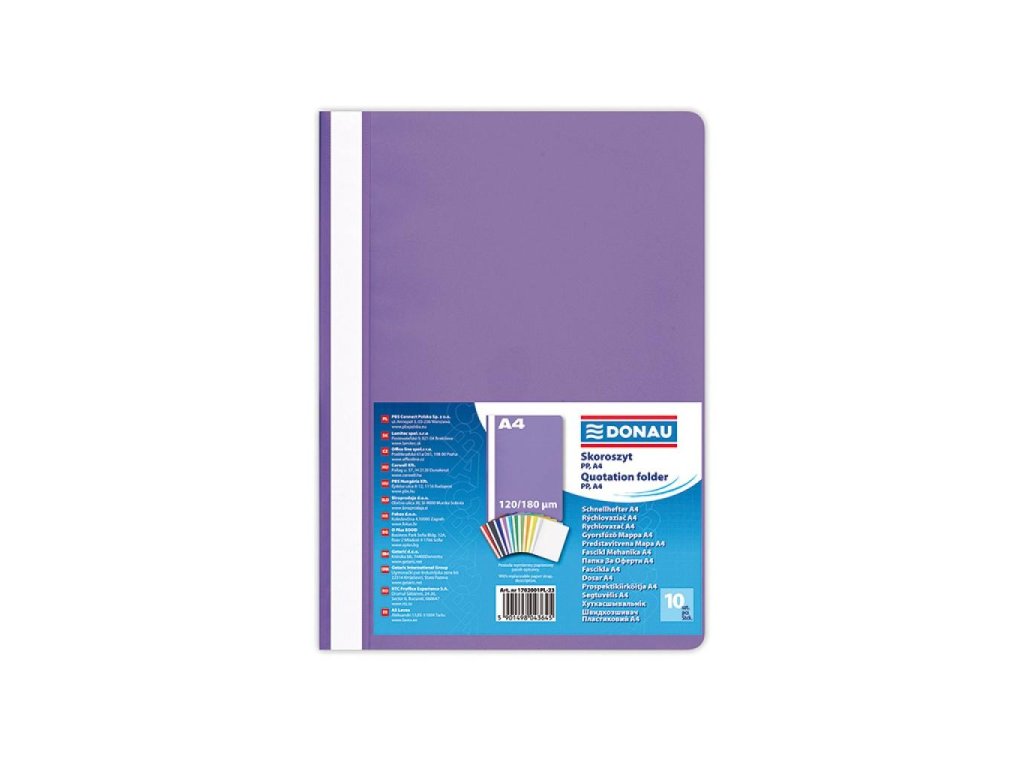 Štandardný polypropylénový rýchloviazač s priehľadnou prednou stranou a nasúvacím popisným pásikom. Formát A4. Balenie 10 ks.Farba: fialová