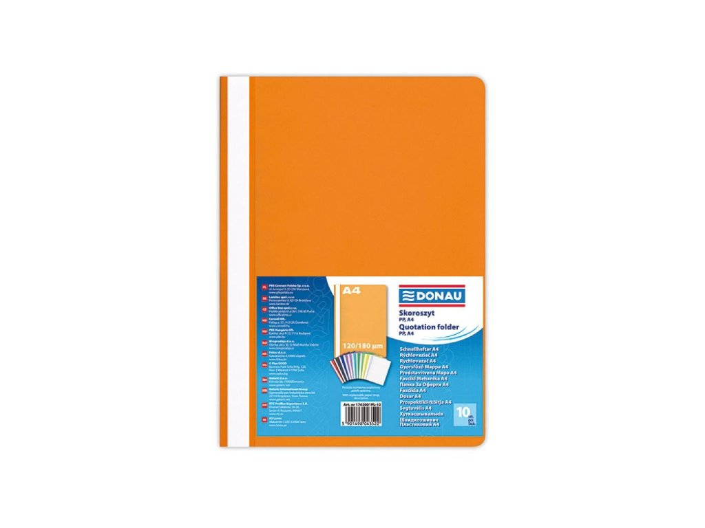 Štandardný polypropylénový rýchloviazač s priehľadnou prednou stranou a nasúvacím popisným pásikom. Formát A4. Balenie 10 ks.Farba: oranžová