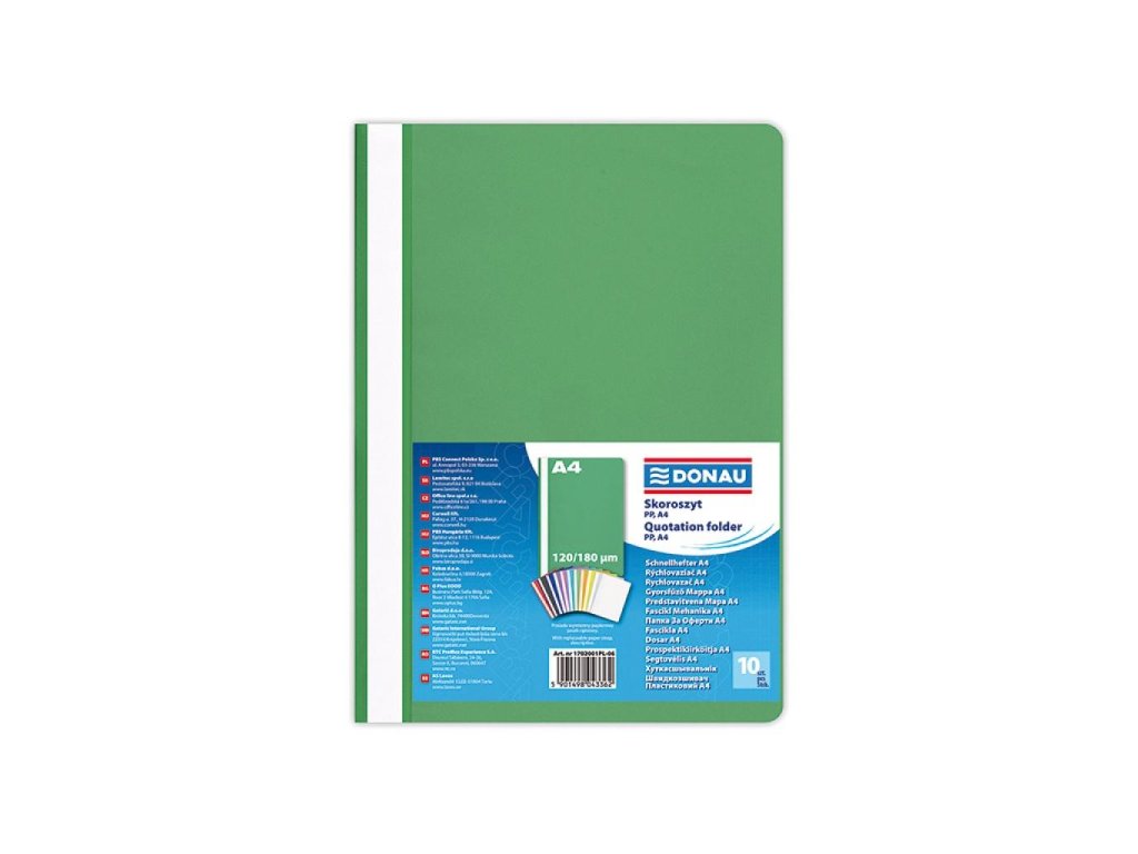 Štandardný polypropylénový rýchloviazač s priehľadnou prednou stranou a nasúvacím popisným pásikom. Formát A4. Balenie 10 ks.Farba: zelená