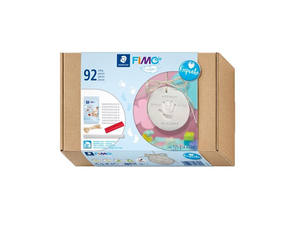 FIMO Air Light "Pamiatka" (Keepsake) sada modelovacej hmoty na vzduchu schnúca je ideálna pri príchode bábätka, krste, na zachytenie dôležitých životných momentov (škôlka, škola, atď.) alebo na sledovanie rastu detí, tvorbu spomienok či darčekov.- FIMO Air Light je ľahká modelovacia hmota schnúca na vzduchu aj v mikrovlnnej rúre, vhodná na výrobu rôznych závesných ozdôb (vianočné ozdoby, veľkonočné vajíčka, venčeky na dvere...).