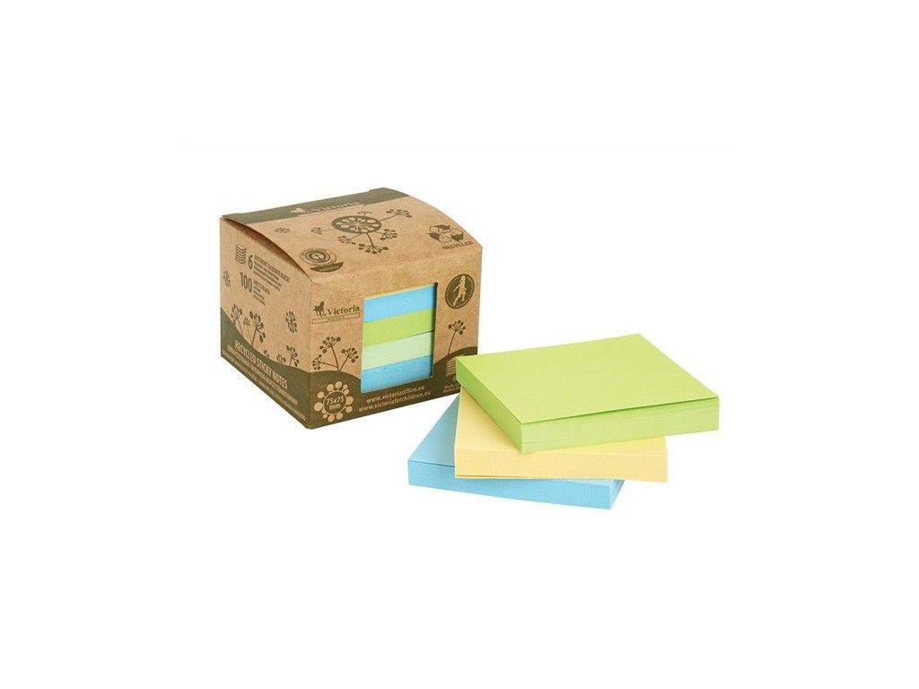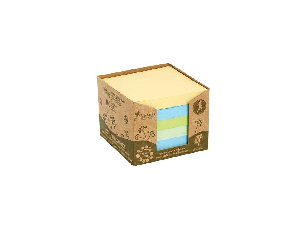 Samolepiace bločky, 75x75 mm, 6x100 listov, z recyklovaného papiera, VICTORIA OFFICE, mix