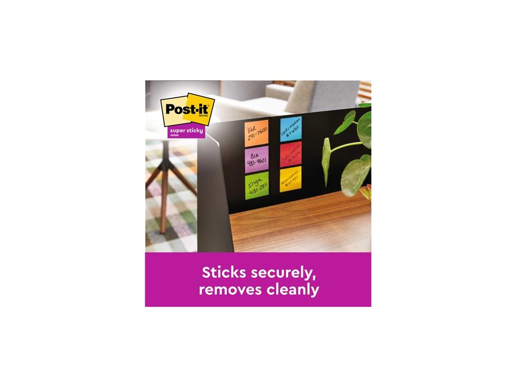 Oproti klasickým samolepiacim bločkom Post-it® poskytuje Post-it® Super Sticky 2x silnejšiu priľnavosť. dokonalé lepenie na zvislé povrchy vhravých a živých farbách s certifikátom PEFC lepidlo z obnoviteľných zdrojov, 60% rastlinného pôvoduDodatočné parametre