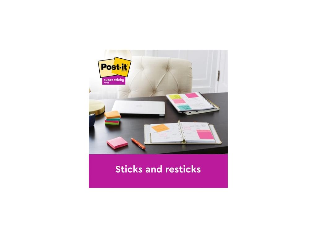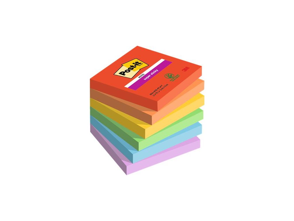 Oproti klasickým samolepiacim bločkom Post-it® poskytuje Post-it® Super Sticky 2x silnejšiu priľnavosť. dokonalé lepenie na zvislé povrchy vhravých a živých farbách s certifikátom PEFC lepidlo z obnoviteľných zdrojov, 60% rastlinného pôvoduDodatočné parametre