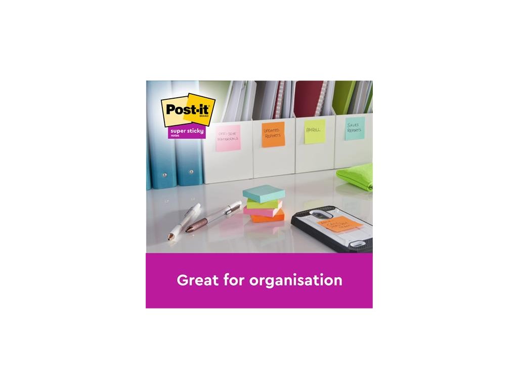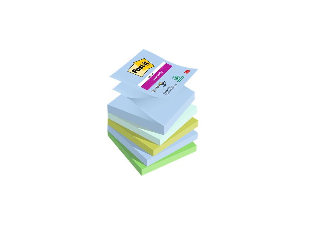 Oproti klasickým samolepiacim bločkom Post-it® poskytuje Post-it Super Sticky 2x silnejšiu priľnavosť. dokonalé lepenie na zvislé povrchy v zaujímavých farbách upokojujúce farby lepidlo z obnoviteľných zdrojov, 60% rastlinného pôvoduDodatočné parametre