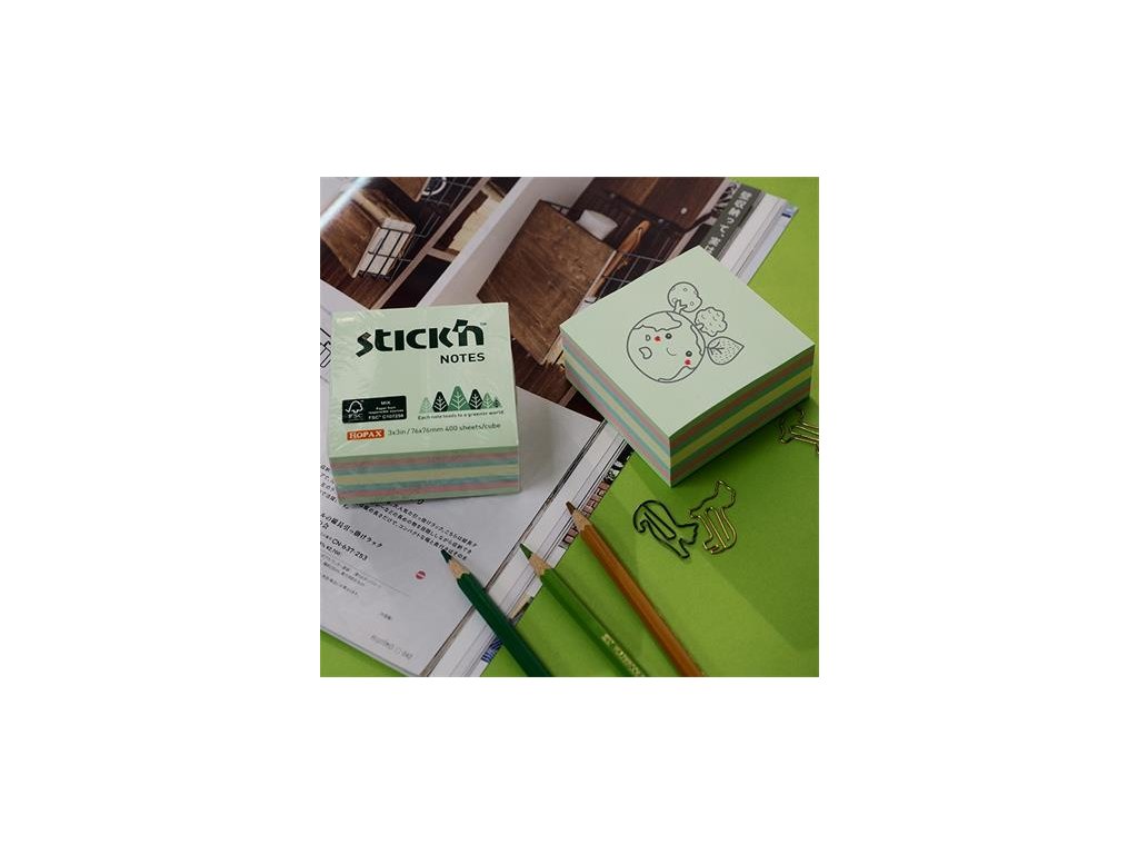 Samolepiaci blok, 76x76mm, 400 listov, STICK N, farby lesa, mix pastelových farieb