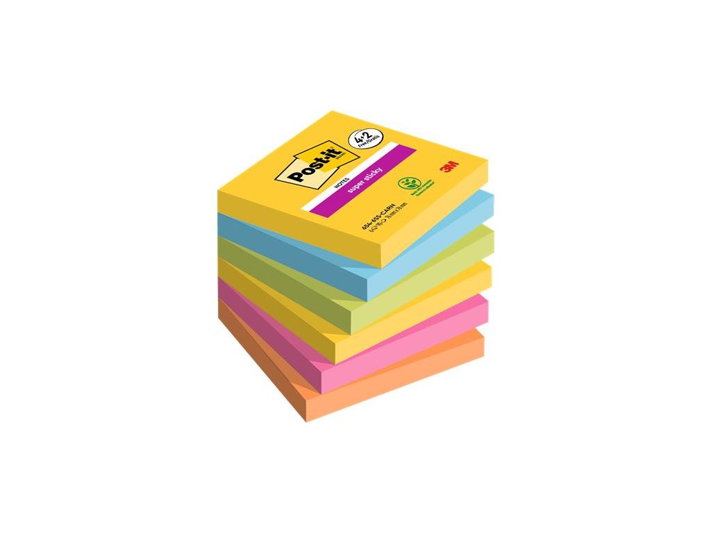 Lepiace bločky Post-it® Super Sticky sú dvakrát pevnejšie ako originálne bločky Post-it®. Sú mimoriadne pevné, všestranné a prichádzajú v rôznych jemných, jasných a žiarivých farbách, aby zvýraznili vašu správu. -jedinečný výber jasných a vzrušujúcich farieb z kolekcie Carnival dodá energiu a rozjasní váš deň -ideálny pre vertikálne alebo ťažko priľnavé povrchy, ako sú monitory, dvere alebo steny -materiál samolepky Post-it® Super Sticky self- lepiaci poznámkový blok je papierové vlákno s certifikátom PEFC, ktoré je trvalo udržateľné, pochádza z lesníctva a kontrolovaných zdrojov – obnoviteľné lepidlo vyrobené zo 60 % viacročných rastlín – stiahnite si bezplatnú aplikáciu Post-it®, zaznamenajte a uložte si svoju prácu okamžite, aby ste mohli svoje správy oznámiť svojmu tímu členov bezodkladneDodatočné parametre