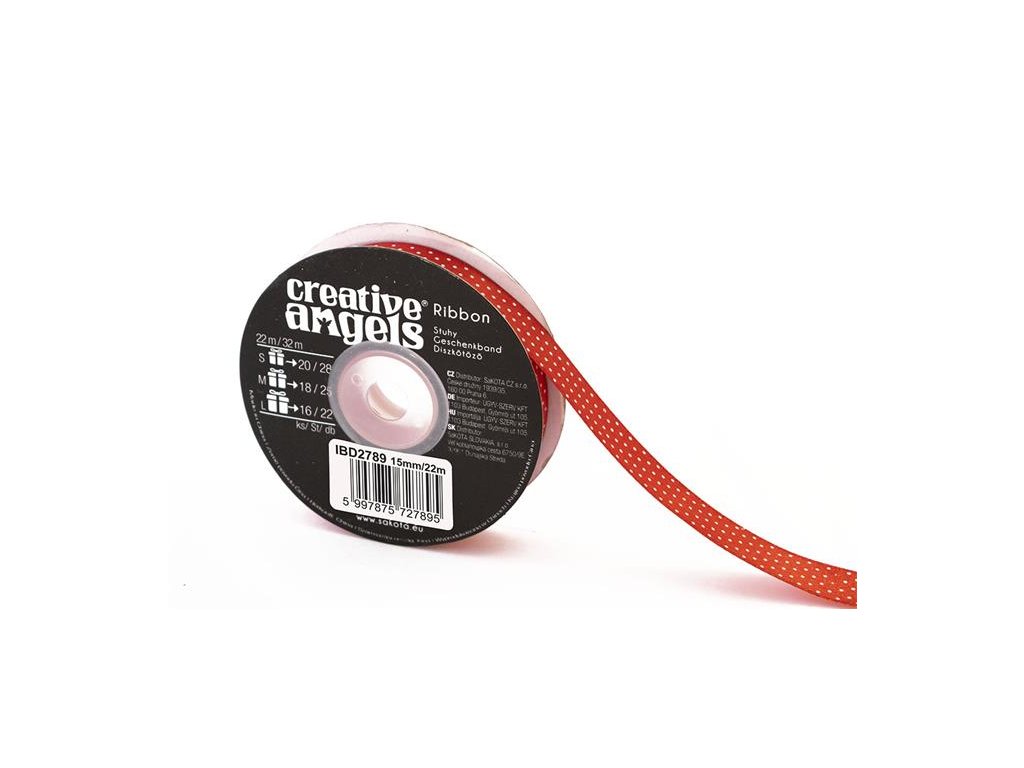 Saténová stuha, 15 mm x 22 m, červená s bielymi bodkami