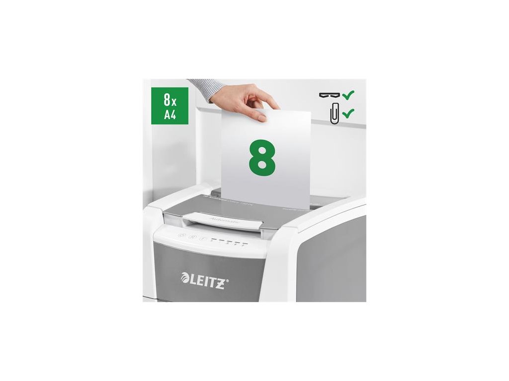 Tichá prevádzka - pre pokojnú prácu -automatické dávkovanie: max. 150 listov A4 -manuálny dávkovací otvor: max. Pre 8 listov (80 g / m2) - Jedinečná funkcia čistého vyprázdňovania (rezačka sa otáča po každom použití), ktorá zabráni tomu, aby papierový odpad počas vyprázdňovania padal za odpadovú nádobu. -infračervený senzor nasýtenia nádrže Signál -80% nasýtenia varuje pred včasným vyprázdnením odpadovej nádoby -Extrémne tichý pre pokojné pracovné prostredie (s pravidelným používaním olejových platní Leitz) - bezlogická technológia na bezproblémové zničenie dokumentov (automatické zastavenie a výstup papiera pri vložení príliš veľkého množstva papiera) - nepretržitá prevádzková doba 30 minút umožňuje zničiť celý obsah vstupného zásobníka naraz -ECO režim je aktivovaný 3 minúty po použití -DIN P4 úroveň zabezpečenia konfety rezanie (4x30mm) -44L výsuvná nádoba na odpad, ktorá umožňuje zlikvidovať celý obsah vstupného zásobníka naraz -Dotykové ovládanie pre jednoduché a intuitívne použitie ničí aj bankové karty, sponky a spinky rozmery: 365 (š) x 618 (ma) x 430 (me) mm -2 + 1-ročná záruka (aj na rezacie nože) - zaregistrujte sa na ďalšiu 1-ročnú záruku Značka: LEITZ Výrobca: Esselte Kft. Adresa: 1139 Budapest, Lomb u. 37-39. A ép. II. 8., Hungary Web: https://www.accobrands.com/brands/ Email: hungarymarketing@acco.comDodatočné parametre