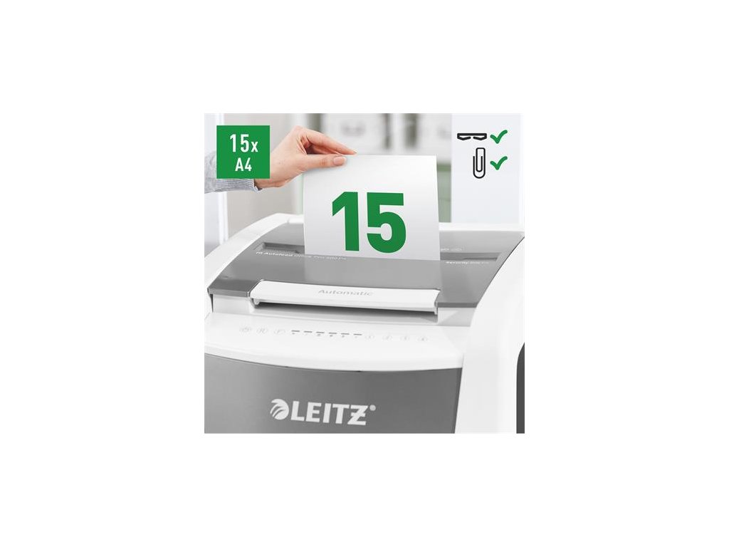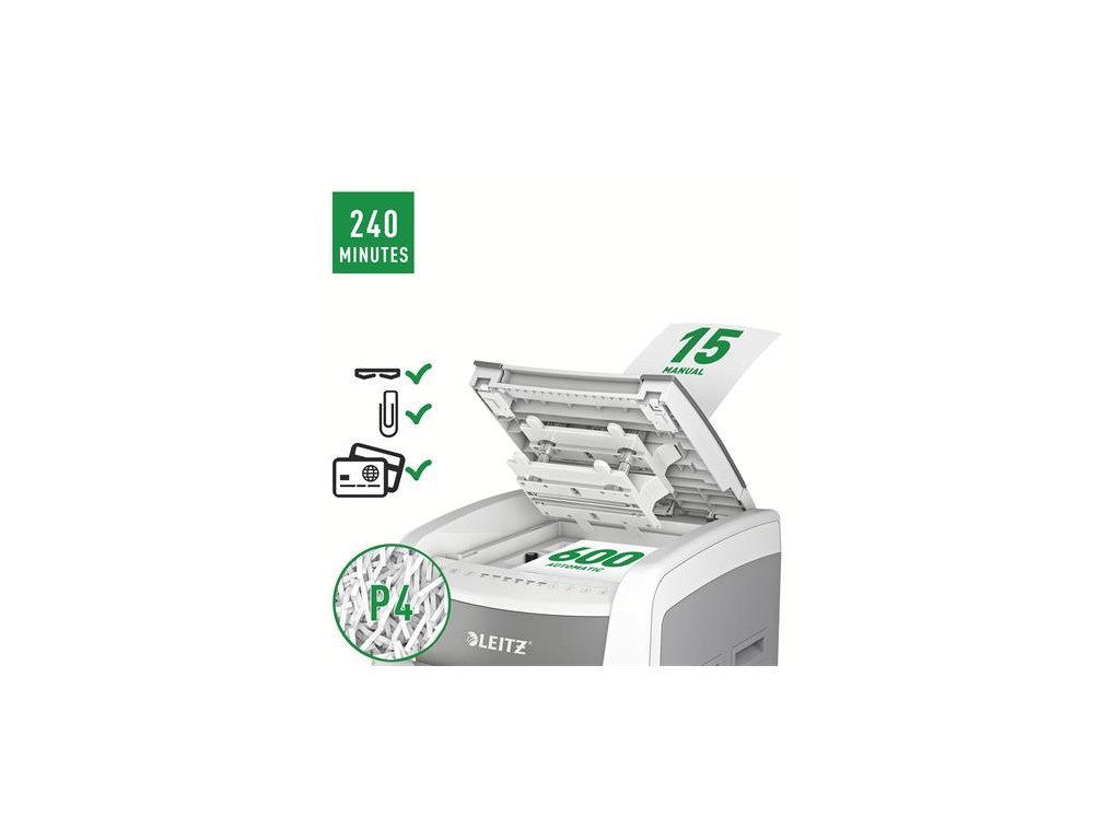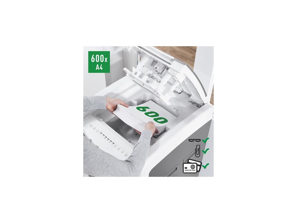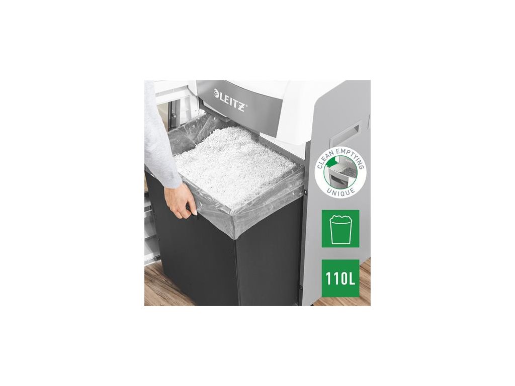 Tichá prevádzka - pre pokojnú prácu -automatické dávkovanie súčasne max. 600 listov A4 -manuálny dávkovací otvor: max. Pre 15 listov (80 g / m2) - Jedinečná funkcia čistého vyprázdňovania (rezačka sa otáča po každom použití), ktorá zabráni tomu, aby papierový odpad počas vyprázdňovania padal za odpadovú nádobu. -infračervený senzor nasýtenia nádrže Signál -80% nasýtenia varuje pred včasným vyprázdnením odpadovej nádoby -Extrémne tichý chod pre pokojné pracovné prostredie (s pravidelným používaním olejových platní Leitz) - bezlogická technológia na bezproblémové zničenie dokumentov (automatické zastavenie a výstup papiera pri vložení príliš veľkého množstva papiera) - nepretržitá prevádzková doba 240 minút umožňuje zničiť celý obsah vstupného zásobníka naraz -ECO režim je aktivovaný 3 minúty po použití -DIN P4 bezpečnostná úroveň konfety strih (4 x 36 mm), dizajn bez okien, ktorý skrýva papierový odpad z pohľadu -110L odpadkový kôš, ktorý umožňuje zničenie celého obsahu podávača papiera naraz -PIN kód uzamknutý, dotykový ovládací panel pre maximálnu spoľahlivosť a bezpečnosť ničí aj bankové karty, sponky a spinky -jednoduchý pohyb vďaka vysoko kvalitným kolesám rozmery: 510 (š) x 960 (m) x 570 (m) mm -2 + 1-ročná záruka (aj na rezacie nože) - zaregistrujte sa na ďalšiu 1-ročnú záruku Značka: LEITZ Výrobca: Esselte Kft. Adresa: 1139 Budapest, Lomb u. 37-39. A ép. II. 8., Hungary Web: https://www.accobrands.com/brands/ Email: hungarymarketing@acco.comDodatočné parametre