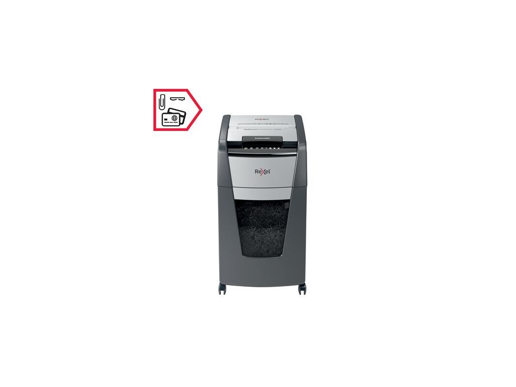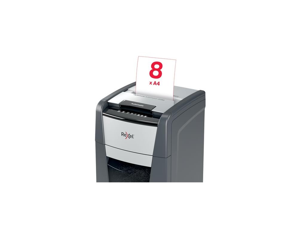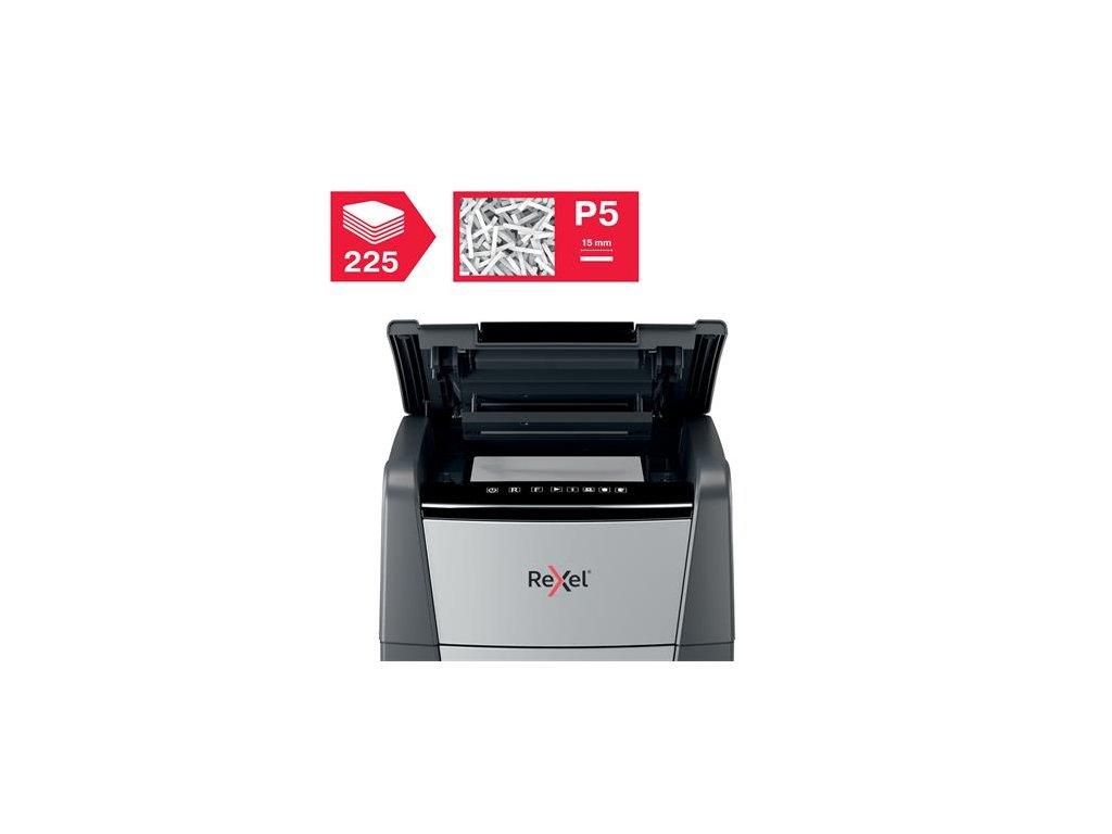 automatický skartovač na osobné a kancelárske použitie vhodné na ničenie bankových kariet, sponiek technológia prito zaseknutiu dotykový ovládací panel detekcia saturácie infračervenej nádrže výrez: 2x15 mm mikrokonfety úroveň bezpečnosti: P-5 automatický podávač dokáťe zničiť až 225 listov (80g) kapacita 8 listov cez otvor pre ručné podávanie hlučnosť: 55dBA nepretržitá prevádzková doba: 30 minút prepne do režimu spánku po 3 minútach nečinnosti objem na odpad: 60 litrov vysúvacia nádoba na odpad valčekové kolesá 2 ročná záruka na zariadenie 2 ročná záruka na sekáč Značka: REXEL Výrobca: Esselte Kft. Adresa: 1139 Budapest, Lomb u. 37-39. A ép. II. 8., Hungary Web: https://www.accobrands.com/brands/ Email: hungarymarketing@acco.comDodatočné parametre