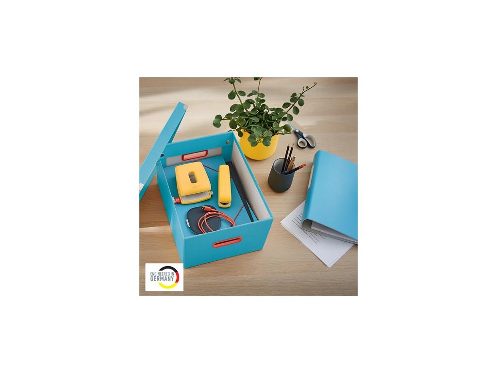 Vhodná na ukladanie dokumentov až do veľkosti A3 alebo iných väčších predmetov Je ideálna na ukladanie alebo prenášanie vybavenia domácej kancelárie alebo na hot-desking v kancelárii Odnímateľné veko uchováva obsah v bezpečí a ukrytý pred zvedavými pohľadmi Rýchle a jednoduché skladanie/rozkladanie pomocou spínačiek Ak sa nepoužíva, dá sa úplne zložiť a tak ušetriť miesto Obsahuje štýlové červené otvory na pohodlné uchopenie pri zdvíhaní a prenášaní Patentovaná konštrukcia zaručuje väčšiu ochranu pred náhodným rozložením škatule pri prenášaní ťažkých predmetov Vyrobené z pevného vysokokvalitného kartónu pre dlhú životnosť, čistá, polomatná PP povrchová úprava Balenie bez plastov Kolekcia Leitz Cosy kombinuje komfort domáceho pohodlia s prvotriednou kvalitou a vytvára tak pozitívne a produktívne pracovné prostredie Značka: LEITZ Výrobca: Esselte Kft. Adresa: 1139 Budapest, Lomb u. 37-39. A ép. II. 8., Hungary Web: https://www.accobrands.com/brands/ Email: hungarymarketing@acco.comDodatočné parametre