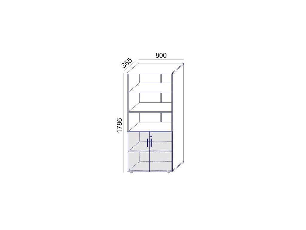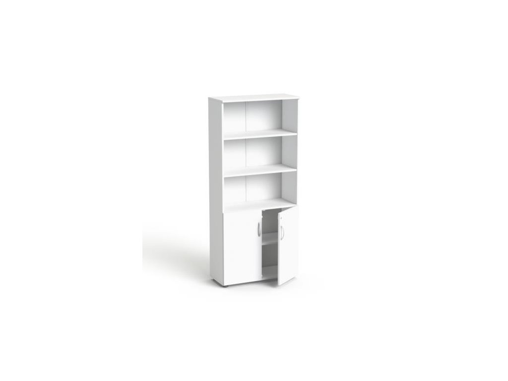 Kombinovaná skriňa, výška na 5 zakladačov, s dverovou a otvorenou policovou časťou.Uzamykateľná kľúčom.