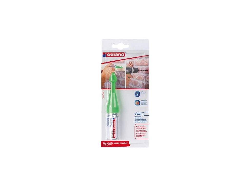Tekutý kriedový sprej s patentovaným pumpovým mechanizmom pre nepermanentné značenie na ťažko dostupných miestach, takmer na všetky materiály. - jedinečne tvarovaná tryska umožňuje značenie otvorov s hĺbkou 50 mm a priemerom 3-13 mm - možno ju použiť z akéhokoľvek uhla a výšky, dokonca aj nad hlavou - nepermanentnú tekutú kriedu možno ľahko zotrieť z nesavých povrchov pre rýchle opravy - farba: neónovo zelená Značka: EDDING Výrobca: EDDING INTERNATIONAL GMBH Adresa: Bookkoppel 7, 22926 Ahrensburg, Germany Web: www.edding.com Email: info@edding.comDodatočné parametre